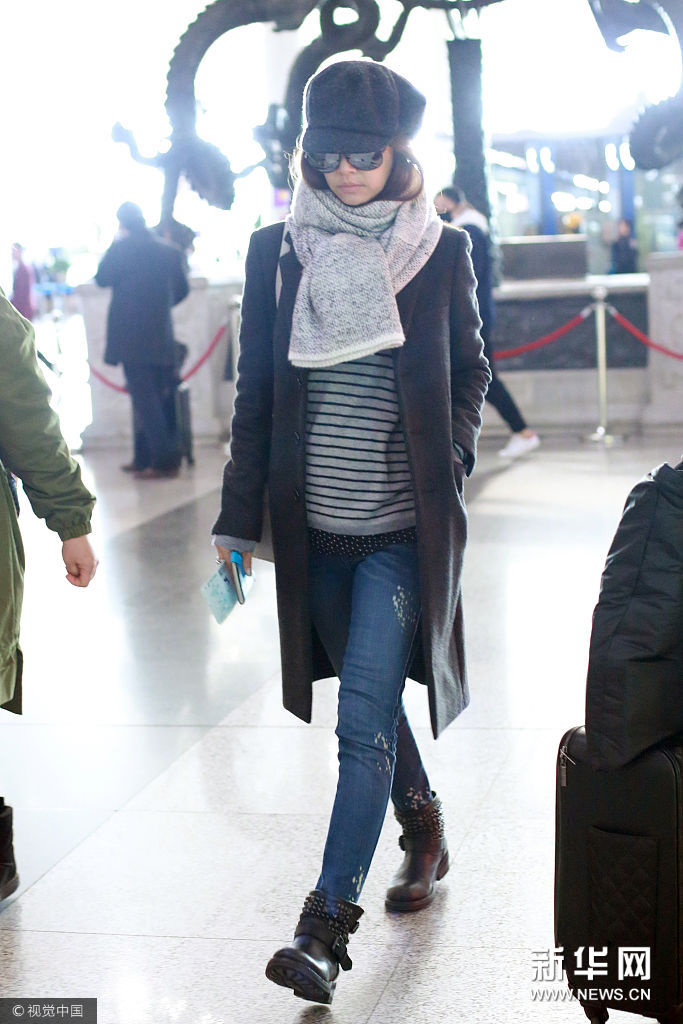 ??? 北京,近日,林心如現(xiàn)身首都機(jī)場(chǎng)。 林心如頭戴灰色毛呢報(bào)童帽,黑色太陽鏡遮面,身穿黑色毛呢修身毛呢大衣外套,脖帶淺灰色針織圍脖,內(nèi)搭條紋T恤,肩背白色Herems凱莉包,下穿深藍(lán)色磨白緊身牛仔褲,腳穿鉚釘平底踝靴。