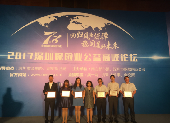 7月6日,由深圳市金融辦、深圳保監(jiān)局指導(dǎo),深圳市保險(xiǎn)同業(yè)公會和南方都市報(bào)聯(lián)合主辦的“2017深圳保險(xiǎn)業(yè)公益高峰論壇”在深圳五洲賓館召開,太平財(cái)險(xiǎn)深圳分公司榮獲“2017深圳保險(xiǎn)業(yè)精準(zhǔn)扶貧先進(jìn)單位”稱號。
