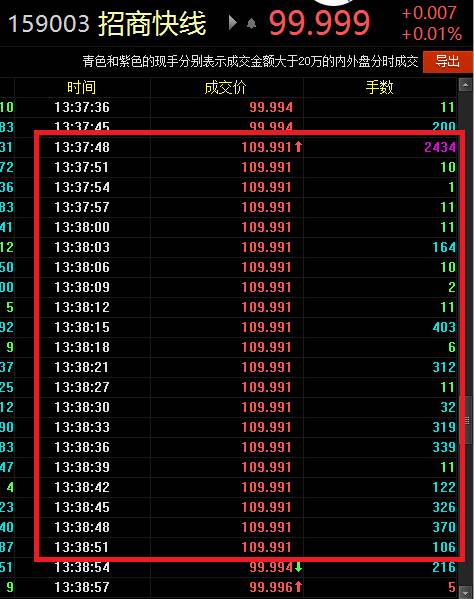 根據(jù)Wind數(shù)據(jù)顯示,招商快線13日的開盤價格為99.991,此后一直在99.990—99.995之間波動,但到13:37:48突然出現(xiàn)了2434手的大單,成交價格為109.991,在一分鐘左右的時間,同一價格上又陸續(xù)出現(xiàn)了20筆成交,隨后價格恢復(fù)到99.994。