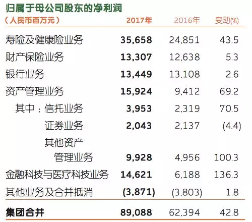 除了個人業(yè)務(wù)的大放異彩,平安集團的核心金融業(yè)務(wù)也是年報的一大亮點。2017年,中國平安的壽險及健康險新業(yè)務(wù)價值大增32.6%,內(nèi)含價值營運回報率35.5%;產(chǎn)險市場份額提升1.3個百分點;銀行零售業(yè)務(wù)凈利潤占比提升至67.6%。