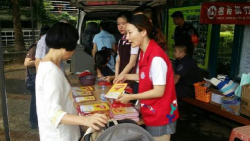 社區(qū)工作人員向居民介紹便民服務(wù)活動(dòng)