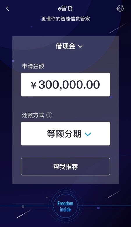 全新升級Freedom引擎后的e智貸,借助其自身的Freedom核心推薦的強大功能,通過極速的信息搜集和計算,可秒級判斷可貸額度,并為客戶量身推薦e招貸、e閃貸、分期還款等多種產(chǎn)品。