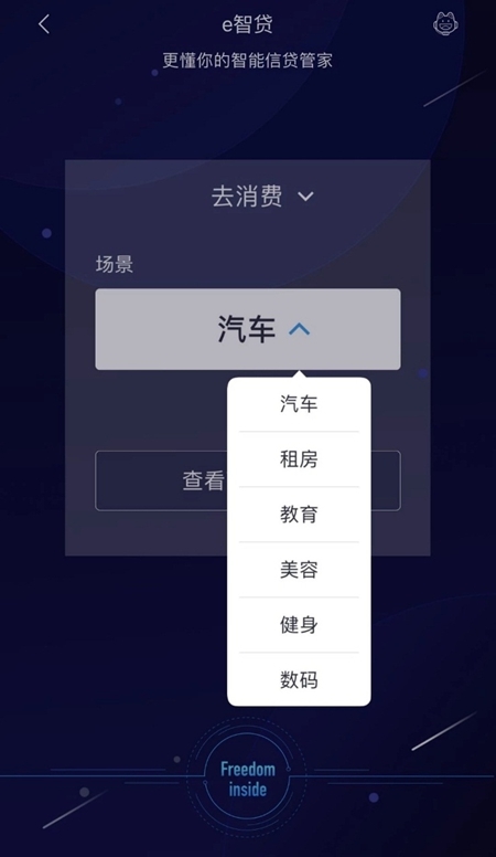 在客戶點擊e智貸后,F(xiàn)reedom還會根據(jù)客戶需求通過點擊「去消費」就能推薦汽車、租房、教育、美容、健身、數(shù)碼等服務,助力客戶開啟品質(zhì)生活。