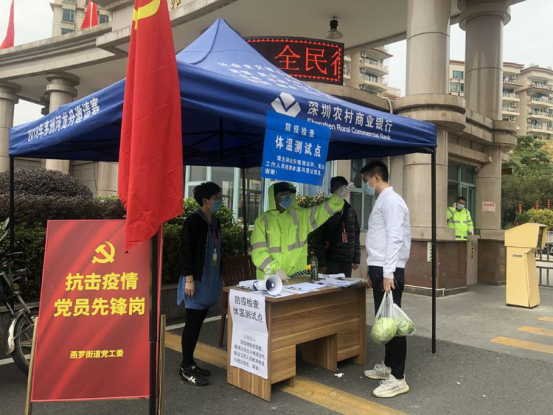 隨著疫情防控形勢的發(fā)展,深圳各街道各社區(qū)都不斷加強(qiáng)疫情防控,在道路口、社區(qū)出入口、樓棟出入口對進(jìn)出車輛和人員進(jìn)行篩查。在燕羅街道、松崗街道轄內(nèi)的道路卡口、社區(qū)門口、街道養(yǎng)老院、工廠等防疫檢查站點(diǎn),記者看到很多印有深圳農(nóng)商行名稱的藍(lán)色帳篷。一頂頂帳篷就像一把把‘保護(hù)傘’,為防控工作人員提供了遮風(fēng)擋雨的場所,也守護(hù)著轄區(qū)居民的健康。