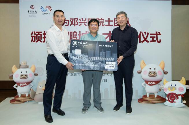 深圳新聞網(wǎng)·見圳客戶端2020年11月8日訊 昨日,深圳市光明區(qū)委常委、組織部部長繩萬青,中國銀行深圳市分行副行長韓竹代表深圳市光明區(qū)人才辦和中國銀行深圳市分行,為生物學(xué)家、美國國家科學(xué)院院士鄧興旺及部分團(tuán)隊成員頒發(fā)了“中銀鵬城人才卡”鉆石卡,這是全市范圍內(nèi)首張向在深院士發(fā)放的“中銀鵬城人才卡”,標(biāo)志著這張由光明區(qū)人才辦和深圳中行共同策劃推出的人才卡實現(xiàn)了市級認(rèn)定的各層級人才全覆蓋。鄧興旺院士是深圳市杰出人才獲得者、深圳市作物分子設(shè)計育種研究院院長、深圳興旺生物種業(yè)有限公司董事長,他帶領(lǐng)團(tuán)隊2010年到深圳創(chuàng)業(yè),多年來在水稻領(lǐng)域取得兩項重大技術(shù)突破,其中“潔田模式”大規(guī)模市場示范面積達(dá)到50萬畝,有效加快了中國農(nóng)業(yè)的輕簡化、現(xiàn)代化步伐。