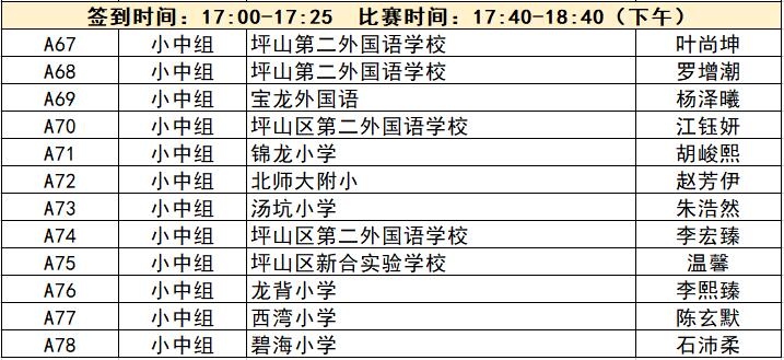 “誰是故事大王·第五季”分為小中組和小高組,此次中行特約專場海選報(bào)名的學(xué)生將以脫稿的形式,不限主題,在限時(shí)5分鐘內(nèi),講述積極健康向上的故事。評委老師們將從四個(gè)維度進(jìn)行評分,其中內(nèi)容占50%、表現(xiàn)技巧占30%、儀態(tài)占10%,以及時(shí)間掌控、創(chuàng)意特色呈現(xiàn)等占10%。最終,本場活動(dòng)將選拔出部分學(xué)生晉級(jí)“誰是故事大王·第五季”深圳市復(fù)賽,他們將和來自指定校園分賽區(qū)、特約專場以及線上分賽區(qū)的選手一起爭奪深圳市決賽名額?,F(xiàn)將上場順序(即所在小組的序號(hào)順序)、名單、簽到時(shí)間、比賽時(shí)間公布如下: