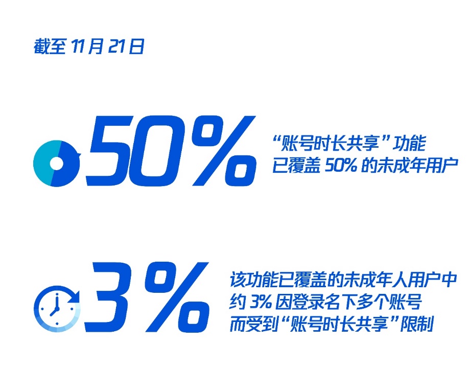 11月15日在《王者榮耀》啟用的“賬號(hào)時(shí)長共享”功能,基于自然人身份對(duì)未成年用戶名下賬號(hào)的總游戲時(shí)長進(jìn)行合并計(jì)算,目前正在逐步發(fā)揮效力。
