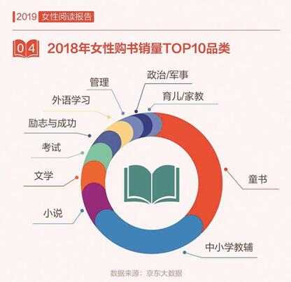 京東大數(shù)據(jù)顯示,女性的讀書量顯著提升,2018年,女性讀者人均購(gòu)書7.6本,高于男性,女性讀者在紙質(zhì)書購(gòu)買上的人均消費(fèi)近230元,女性的“閱讀力”正在變得越來(lái)越強(qiáng)。從圖書銷量上看,2018年女性讀者購(gòu)買最多的圖書是童書、中小學(xué)教輔、小說(shuō)、文學(xué)和考試,可見(jiàn)對(duì)于大部分女性而言,購(gòu)書的主要目的是出于育兒的需求。