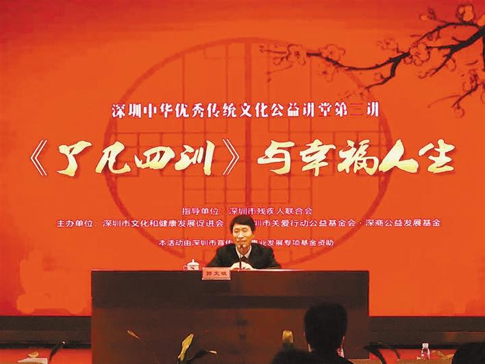 深圳商報2019年03月18日訊 (記者 夏和順/文 韓墨/圖)近日,深圳中華優(yōu)秀傳統(tǒng)文化公益講堂第三場在深圳市殘疾人綜合服務中心開講,這也是傳統(tǒng)文化講堂首次“送課上門”。著名作家郭文斌與市殘聯(lián)系統(tǒng)200多名干部分享“東方勵志奇書”《了凡四訓》所蘊含的人生哲理,探討“安詳生活理念”與幸福人生的關系。據(jù)介紹,本次活動由中華炎黃文化研究會文明傳承委員會、深圳市文明辦指導,深圳市文化與健康發(fā)展促進會主辦。