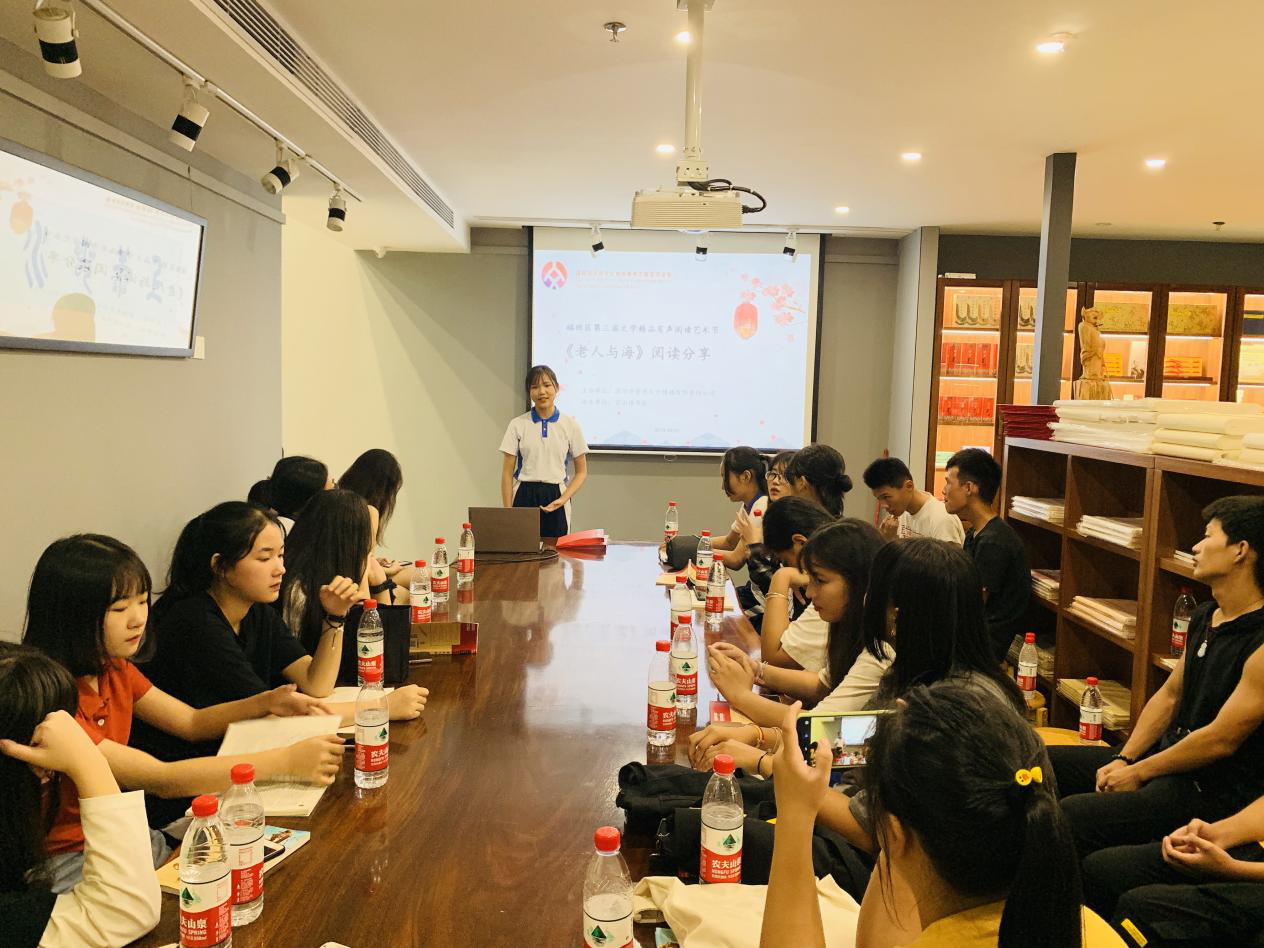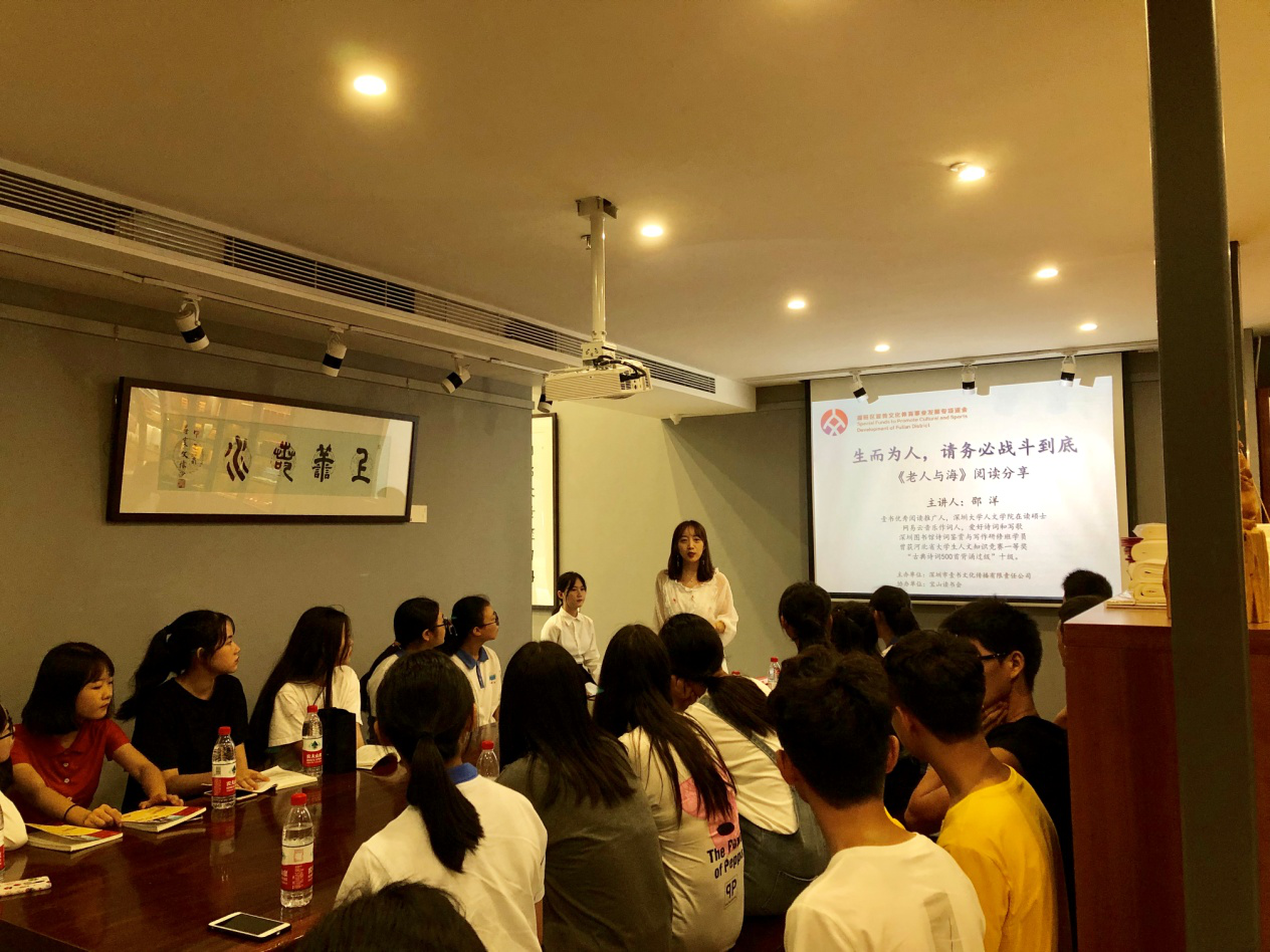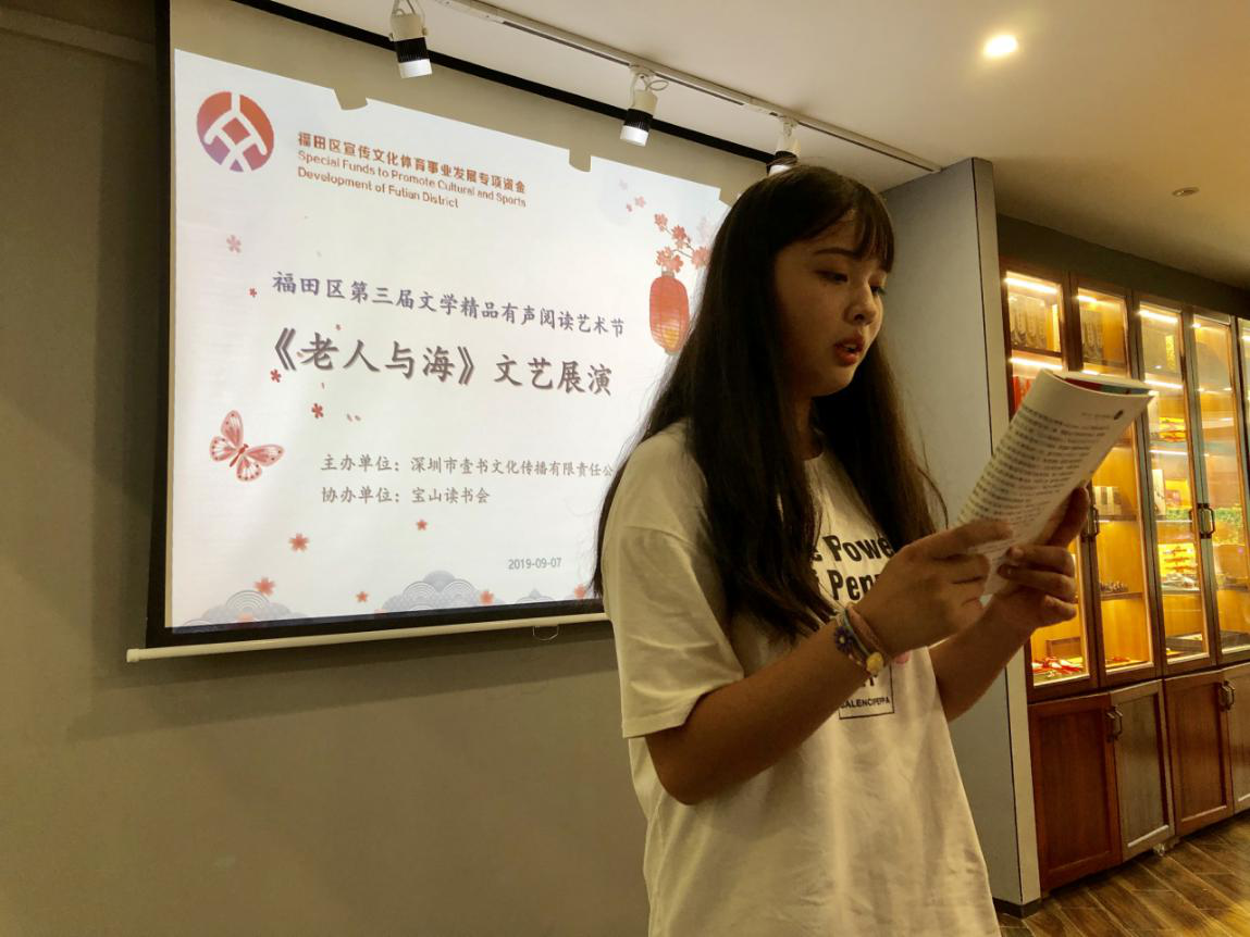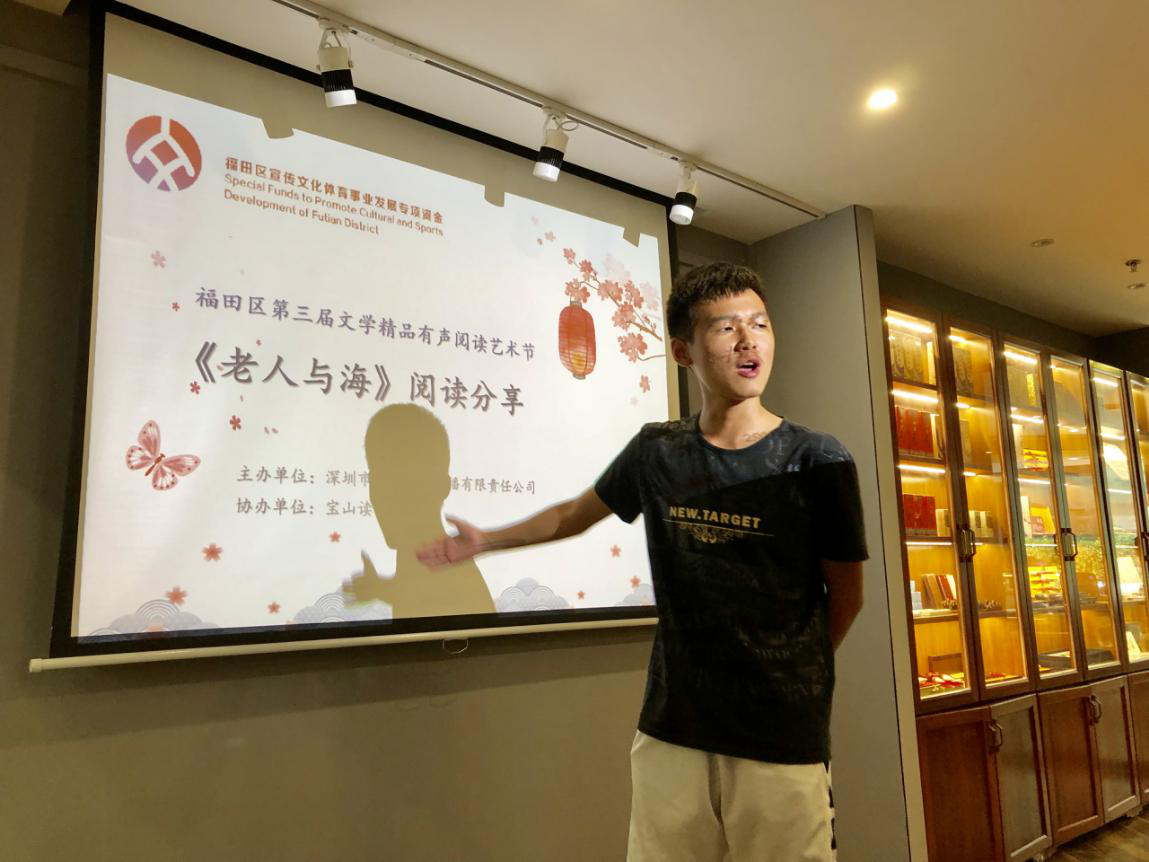深圳新聞網(wǎng)訊 2019年9月7日,由深圳市壹書(shū)文化傳播有限責(zé)任公司主辦、寶山讀書(shū)會(huì)協(xié)辦的“福田區(qū)第三屆文學(xué)精品有聲閱讀藝術(shù)節(jié)”之《老人與?!烽喿x分享會(huì)暨文學(xué)作品朗誦會(huì)在簡(jiǎn)閱書(shū)吧香蜜湖店成功舉辦。來(lái)自深圳市寶山技工學(xué)校的學(xué)子們?cè)谥髦v人的啟示下分享閱讀感悟、誦讀精彩文摘,在文藝展演中體會(huì)圣地亞哥抗擊命運(yùn)的人生哲學(xué)。