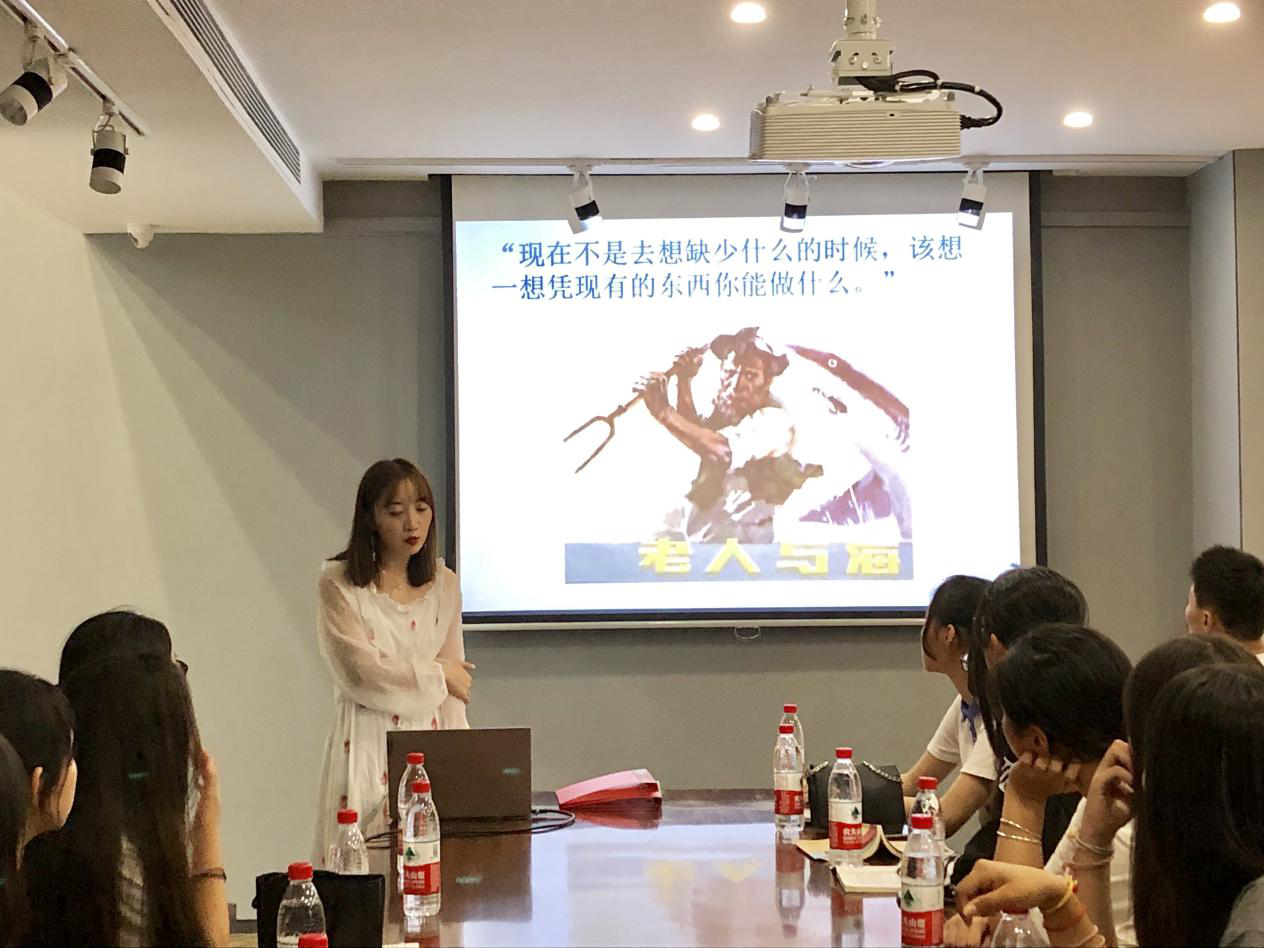 《老人與海》通過(guò)講述一個(gè)老漁夫的故事,揭示了人類共同的命運(yùn),給讀者帶來(lái)關(guān)于勇氣、不屈不撓、與命運(yùn)作斗爭(zhēng)的精神啟迪。圍繞“生而為人,請(qǐng)務(wù)必戰(zhàn)斗到底”這一主題,邵洋提出了“是選擇放棄,還是一往直前?”這一問(wèn)題,引起在座同學(xué)的思考。隨后,她又通過(guò)解讀《老人與?!分械挠飨笈c藝術(shù)、生命與理想,為同學(xué)們總結(jié)值得學(xué)習(xí)的寫作思路。