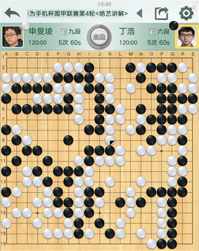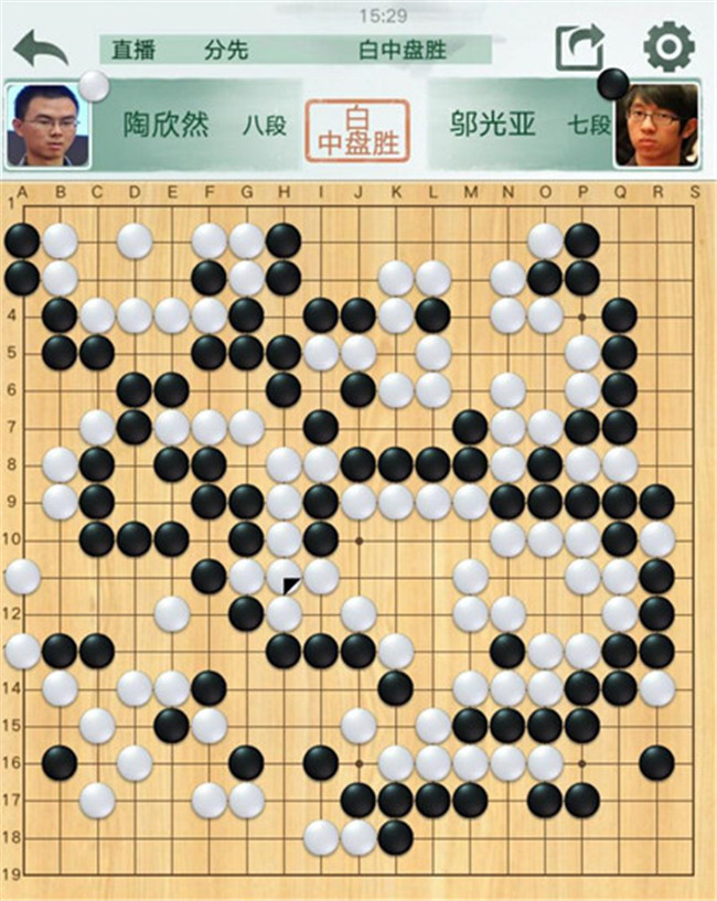 陶欣然執(zhí)白對(duì)陣鄔光亞。黑棋右邊攻擊白棋時(shí)候,連續(xù)失誤,反被白棋妙手吃通棋筋,黑已無法逆轉(zhuǎn)局面。有意思的是,賽前陶欣然遲到2分鐘被罰2分鐘,但絲毫不影響他獲勝。