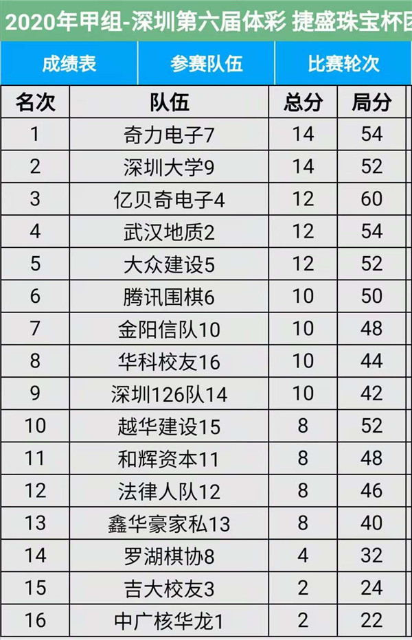 見圳客戶端?深圳新聞網2020年11月15日訊(記者周錦春)第六屆“體彩?捷盛珠寶杯”深圳市圍棋聯(lián)賽繼續(xù)在羅湖區(qū)藝嘉大酒店展開,今天是第三場,有第7輪至第9輪的比賽。目前,超級組中,瑞珂瑪隊、兒童棋院隊在積分榜上排名第一第二,繼續(xù)領先;甲級組中,奇力電子、深圳大學在積分榜上排名第一第二。具體賽程結果請看本文附后表格。