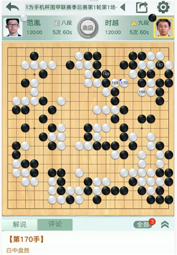 第二臺(tái)慢棋,由深圳隊(duì)的時(shí)越九段執(zhí)黑對(duì)陣民生隊(duì)的范胤八段。開局黑棋左下和左上定型都略有失誤,白棋領(lǐng)先。中盤白棋右上碰三三做劫時(shí)黑棋開劫過急,應(yīng)該下邊分開白棋較好。之后右邊白棋打入時(shí)黑棋應(yīng)對(duì)方向錯(cuò)誤,又有所虧損,進(jìn)入官子時(shí)黑棋已經(jīng)差距過大,難以挽回。時(shí)越執(zhí)黑中盤負(fù)范胤。