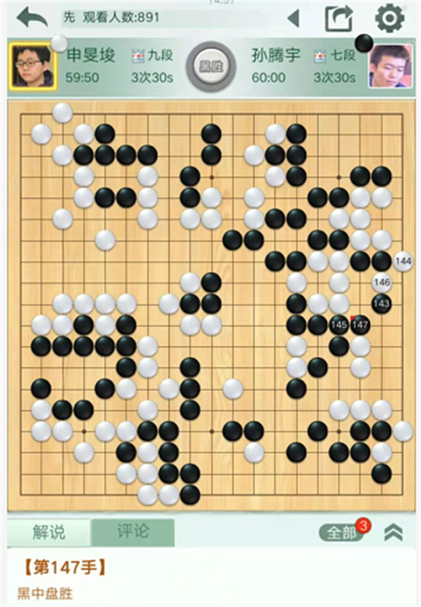 第一臺(tái)快棋,由深圳隊(duì)外援申旻埈九段執(zhí)白對(duì)陣民生隊(duì)的孫騰宇七段。白棋開局順暢,中盤下邊雙方小有失誤,依然白棋領(lǐng)先。之后白棋良好的掌握局面,優(yōu)勢(shì)擴(kuò)大。進(jìn)入官子,白棋沒有補(bǔ)掉隱患,進(jìn)入中央破黑空時(shí)較為沖動(dòng),選點(diǎn)失誤造成虧損。最后被黑右邊進(jìn)入白空后反殺白棋,申旻埈執(zhí)白中盤負(fù)孫騰宇。