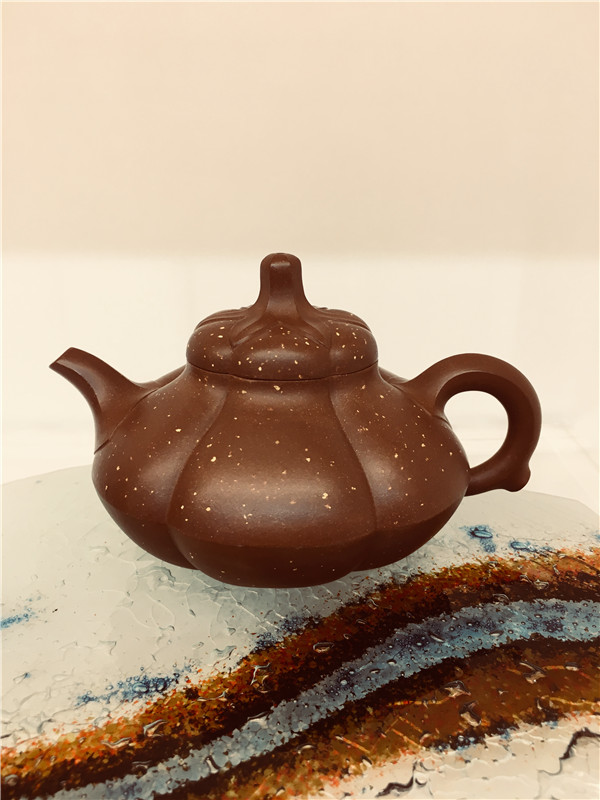 第五件,《笑雪壺》取材于中國傳統(tǒng)名花之梅花的形態(tài),壺鈕為花蒂,壺身等分成六瓣花瓣,圓潤飽滿,宛如盛開的梅花,壺嘴與壺把做成簡化的梅花枝干。顯得蒼勁鋼遒,壺以鋪砂做裝飾,以雪花紛紛飄落,表現(xiàn)出梅花傲霜迎雪,傳春報喜的吉祥寓意。此壺筋囊飽滿凝重,通體線條流暢,細(xì)節(jié)表現(xiàn)精巧,立意新穎,妙趣天成。