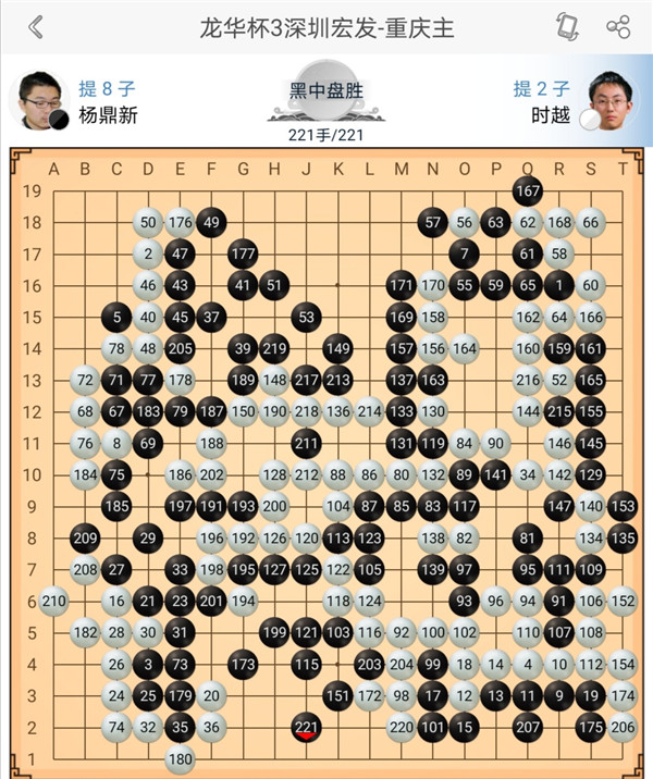 一臺(tái)戎毅執(zhí)黑對(duì)陣?yán)钴幒?,右上?zhàn)斗后黑棋稍有優(yōu)勢(shì),之后黑棋沖擊中央白棋過分,應(yīng)該慢慢收官,白棋正確應(yīng)對(duì),戰(zhàn)斗中便宜后獲得勝利。二臺(tái)主將時(shí)越執(zhí)白對(duì)陣等級(jí)分排名第二的楊鼎新,中盤黑棋打入右邊后形成亂戰(zhàn),白棋失誤比黑棋更多,戰(zhàn)斗結(jié)束進(jìn)入官子時(shí)黑勝勢(shì)。