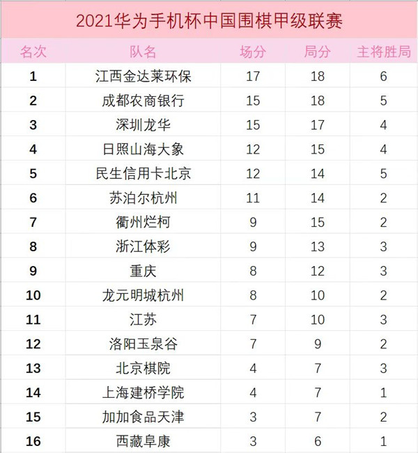 見圳客戶端?深圳新聞網(wǎng)2021年6月7日訊(記者周錦春)華為手機杯男子圍甲聯(lián)賽在浙江長興重燃戰(zhàn)火, 深圳龍華隊1:3不敵日照山海大象隊跌落榜首,排名被江西和成都超越降至第三位。上屆冠軍江西金達(dá)萊環(huán)保隊本階段首輪繼續(xù)保持勝勢,3比1擊敗北京棋院隊,金身不敗豪取6連勝,并登上積分榜首位。