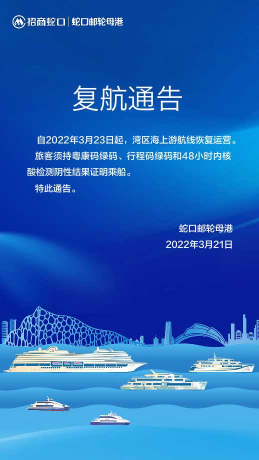 讀特客戶端 ·深圳新聞網(wǎng)2022年3月21日訊(記者 田志強)記者從招商蛇口郵輪母港獲悉,自3月23日起,灣區(qū)海上游航線恢復運營。搭乘該航線的旅客須持粵康碼綠碼、行程碼綠碼和48小時內(nèi)核酸檢測陰性結(jié)果證明乘船。