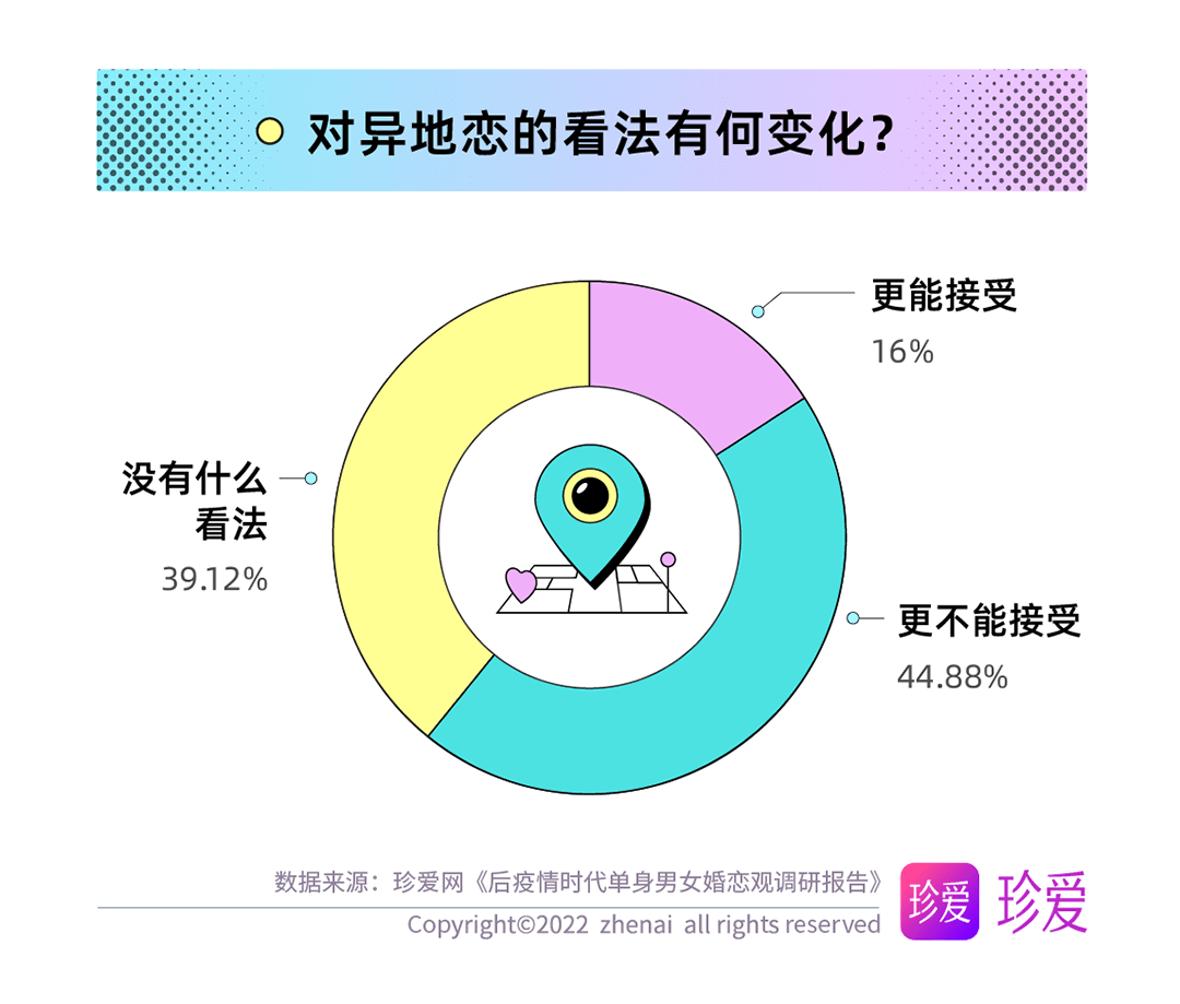 疫情期間的所見所聞使得單身青年們對戀愛模式有了不同的看法,調(diào)查發(fā)現(xiàn),近五成(44.88%)的人表示更不能接受異地戀了;僅16%的人表示更能接受。女性(50.8%)比男性(30.64%)更不能接受異地戀。