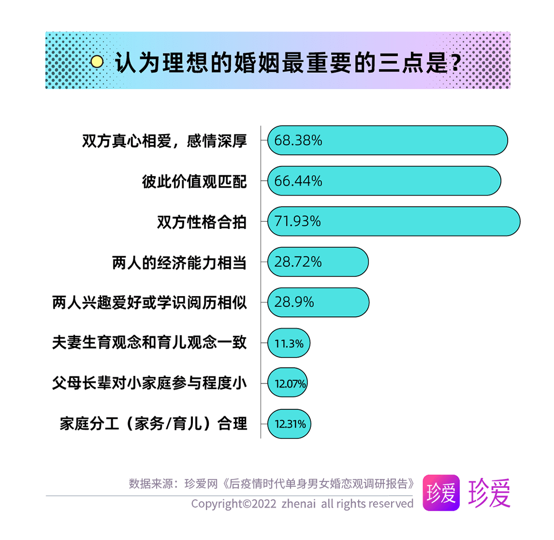經(jīng)歷過疫情后,居家期間的家庭生活或他人的故事也令單身青年們對婚姻有了新的理解,調(diào)查顯示,理想的婚姻最重要的因素為彼此性格合拍(71.93%),高于雙方真心相愛(68.38%)和兩人的價(jià)值觀匹配(66.44%)。