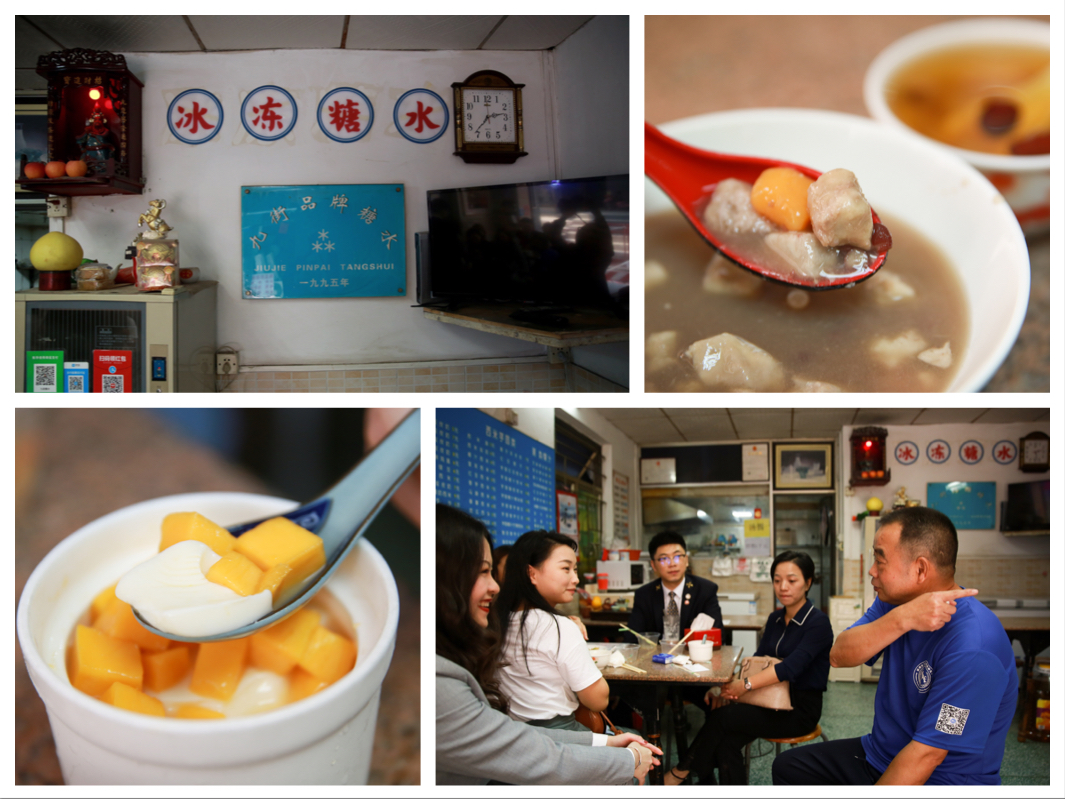 在禮賓司的引領下,大家來到已有千年歷史的文化遺產(chǎn)——南頭古城。一行人在“九街糖水鋪”入座,店主夫妻倆熱情的端出清甜可口的化州糖水和香氣四溢的潮州炒米粉,和我們嘮起了家長里短。大家方才得知,這宛如尋常百姓家的糖水鋪竟開業(yè)于1995年,見證了古城九街的變遷翻新和故去新來的幾代人潮川流。帶著傳播化州糖水美名初衷的糖水世家選擇在深圳發(fā)家,傳到這已是第三代。眾人大快朵頤,禮賓司也幫忙跑堂添茶。