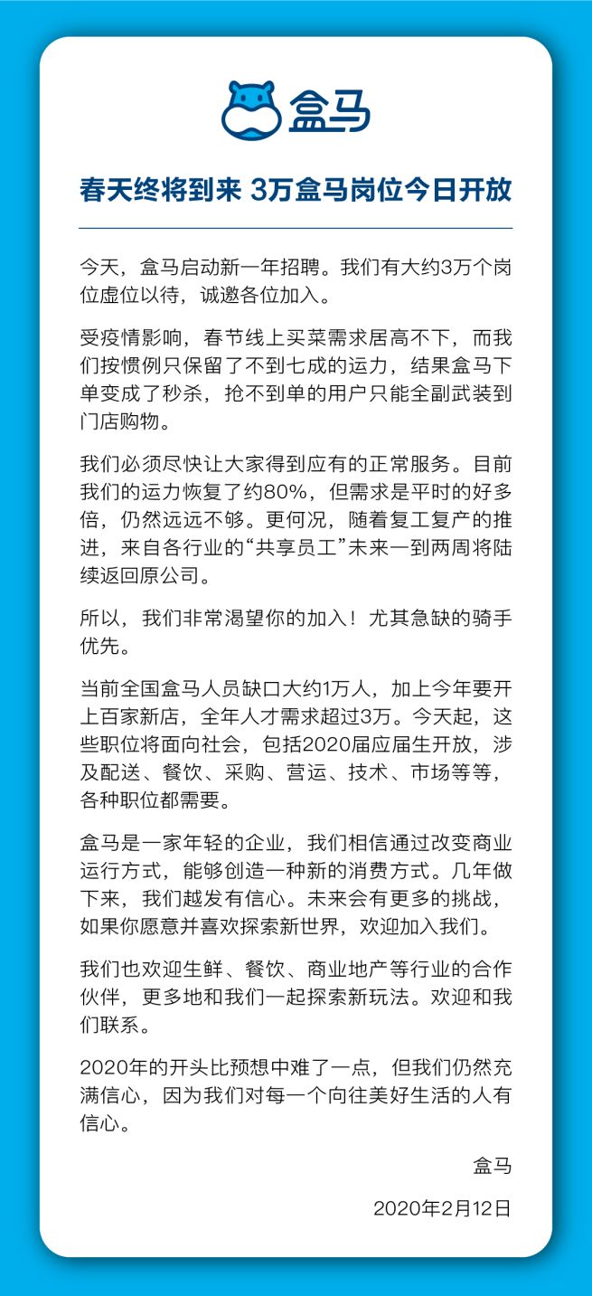 2月12日,盒馬宣布開啟新一輪招聘,開放3萬個崗位,包括總部采購、技術、運營等,也包括一線門店小二,其中配送小哥最為緊急。