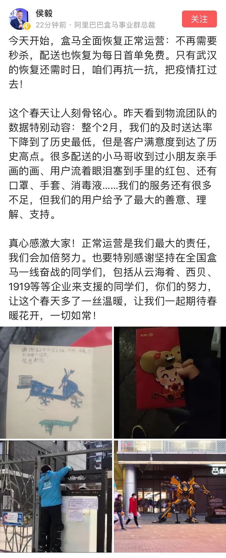 盒馬總裁侯毅在其社交平臺(tái)賬號(hào)上表示,盒馬全面恢復(fù)正常運(yùn)營(yíng)了,用戶也可以告別秒殺了,“疫情期間,正常運(yùn)營(yíng)是我們最大的責(zé)任,我們會(huì)加倍努力。武漢的恢復(fù)還需要一些時(shí)間,大家一起再抗一抗,把疫情扛過(guò)去。”