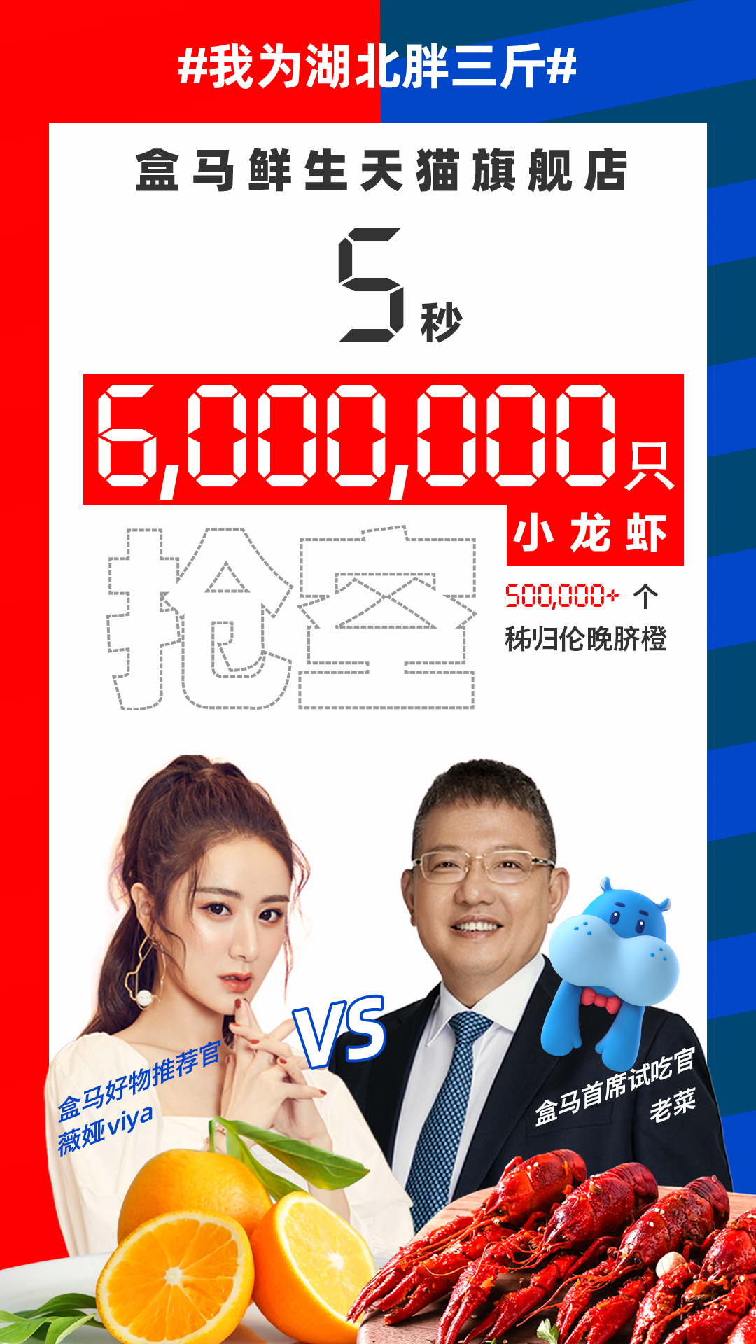 4月21日晚,盒馬總裁侯毅(花名老菜)做客淘寶薇婭直播間,為湖北農(nóng)產(chǎn)品帶貨。侯毅直播時(shí)長半小時(shí),但僅用時(shí)5秒鐘,盒馬鮮生天貓旗艦店內(nèi),網(wǎng)友就買光了600萬只湖北小龍蝦。與小龍蝦一起賣空的還有秭歸倫晚臍橙。25萬斤倫晚,3秒被搶光。超強(qiáng)的帶貨能力,讓兩人獲封“菜見婭”組合。