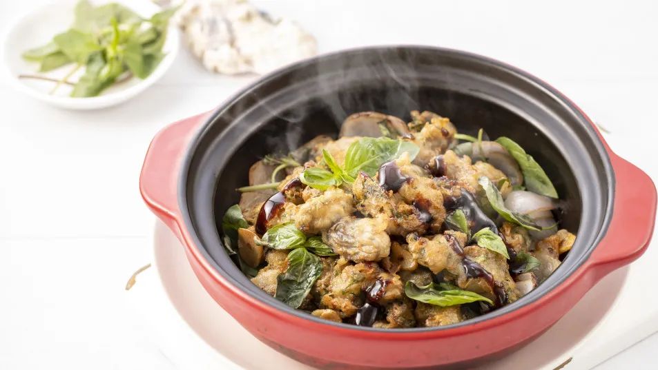 九層塔香燜海蠣:九層塔獨(dú)特的香料風(fēng)味,經(jīng)過細(xì)火干燜,完全滲入到每粒海蠣肉里,趁熱吃,特別香!