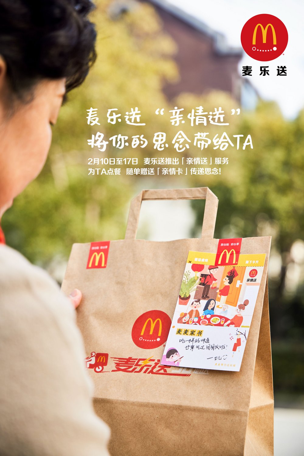 為了讓分隔兩地的顧客表達(dá)對(duì)彼此的思念和祝福,麥樂(lè)送于春節(jié)期間推出“親情送”服務(wù)。2月10日至2月17日,在i麥樂(lè)送小程序、麥當(dāng)勞App、美團(tuán)麥當(dāng)勞店鋪、餓了么麥當(dāng)勞店鋪,顧客可以選擇“親情送”服務(wù),為遠(yuǎn)在異地的親人朋友點(diǎn)餐,麥樂(lè)送會(huì)在訂單中附上【親情卡】,消費(fèi)者可以定制祝福,卡片連同美食將一齊送達(dá)你思念的人手中。