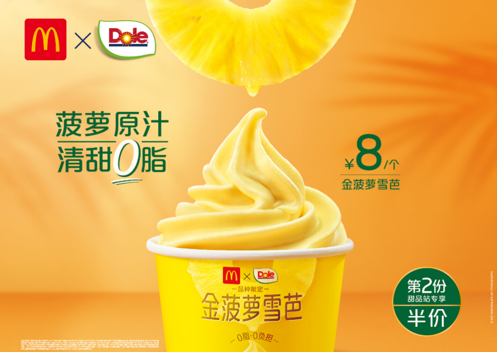 金菠蘿雪芭是麥當(dāng)勞中國(guó)的首個(gè)雪芭類產(chǎn)品,使用都樂原榨金菠蘿汁,清甜爽口,濃濃果香無(wú)負(fù)擔(dān)。選用的都樂金菠蘿產(chǎn)自菲律賓棉蘭老島,口感細(xì)膩甘甜,果肉金黃多汁。金菠蘿雪芭不含牛奶或奶油成分,脂肪含量為零。該產(chǎn)品已2021年4月21日在麥當(dāng)勞中國(guó)28個(gè)城市的2000多個(gè)甜品站售賣,限時(shí)售價(jià)8元,享受第二個(gè)半價(jià)優(yōu)惠。