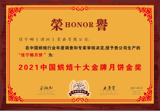 經(jīng)過(guò)多年的發(fā)展與沉淀,佳寧娜月餅以先進(jìn)的工藝、獨(dú)特的口味、卓越的信譽(yù)贏得消費(fèi)者的信賴和支持,曾榮獲“深圳老字號(hào)”“深圳月餅節(jié)質(zhì)量信譽(yù)獎(jiǎng)” (連續(xù)12年 )“中國(guó)食品安全年會(huì)食品安全示范單位”“中國(guó)烘焙五仁月餅金獎(jiǎng)”“中國(guó)烘焙廣式月餅金獎(jiǎng)”“中國(guó)烘焙潮式月餅金獎(jiǎng)”、“中國(guó)烘焙十佳名牌月餅”、“中國(guó)烘焙老字號(hào)月餅“等多項(xiàng)榮譽(yù)稱號(hào)。