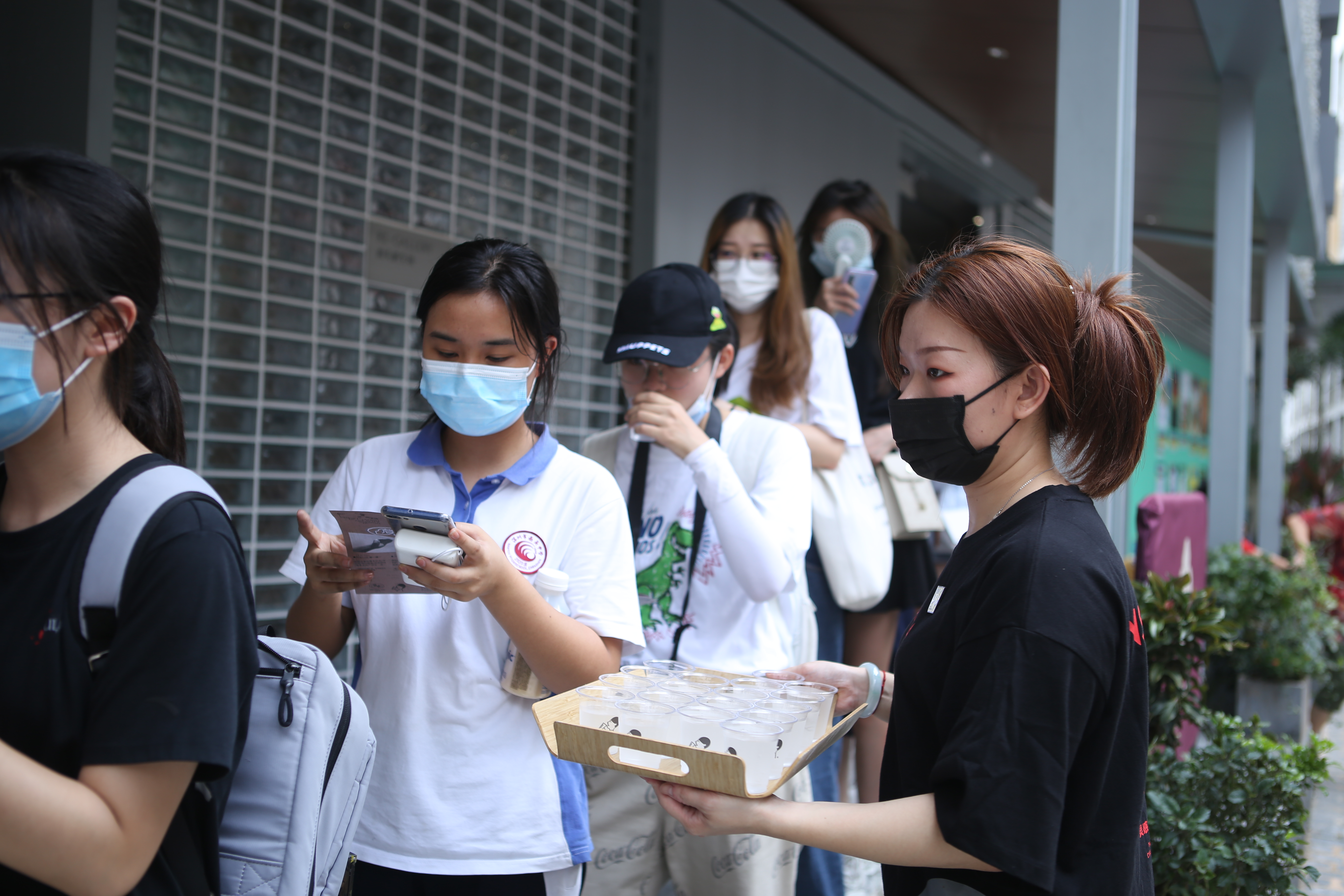 (門店工作人員熱情地為排隊(duì)顧客送上茶飲解渴)
