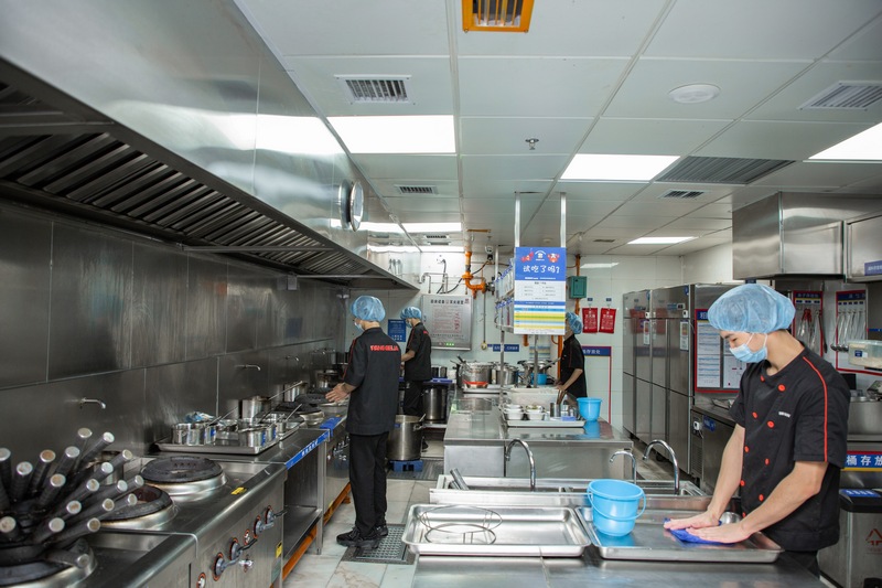 “右手邊是冷菜間,因為食安要求更高,我們都有專門的‘二次更衣室’,在這里更換衣服后,再進入對涼菜進行處理?!必撠熑吮硎?,在專門的涼菜區(qū)里,則可以看到櫥窗中整齊地貼上了諸如“A1圣女果”“B04魚豆腐”之類的標簽,同時備注“當天生產(chǎn)打烊廢棄”和“加工日期與廢棄日期”等具體操作指示?!懊客泶蜢群螅覀円矔米贤饩€燈對冷菜間進行半個小時的消毒。”負責人補充。