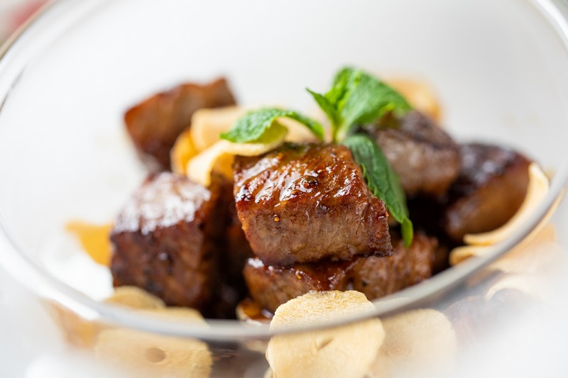 “金蒜一口牛”牛肉切成小方塊,一口就能吃下,櫻桃小嘴也不怕失去儀態(tài)。