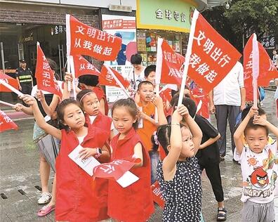 福永街道白石廈社區(qū)婦聯(lián)巾幗志愿者倡導文明出行。