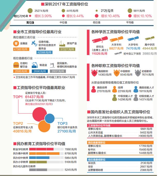 由深圳市人社局發(fā)布的《2017年深圳市人力資源市場(chǎng)工資指導(dǎo)價(jià)位》顯示,2017年,深圳工資指導(dǎo)價(jià)位平均值為5611元/月,比去年上漲10.10%。