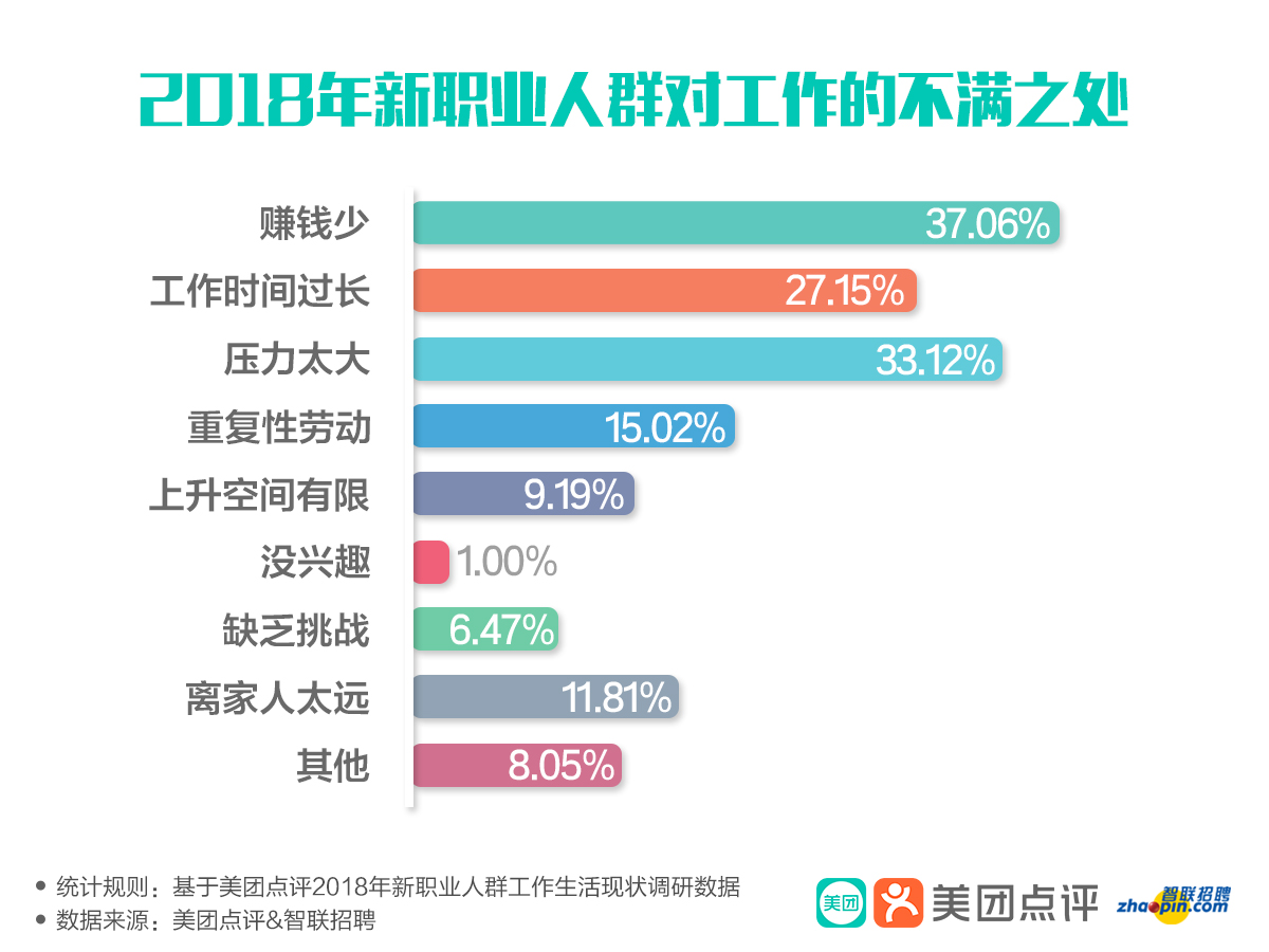 對比智聯(lián)招聘《2018年白領(lǐng)生活狀況調(diào)研報告》來看, 他們的不滿原因也與普通白領(lǐng)大體相近,他們不僅關(guān)注薪酬,也關(guān)注個人成長、工作壓力、沒時間陪家人問題。但整體來看,新職業(yè)人群在經(jīng)濟基礎(chǔ)仍屬薄弱的情況下追求加薪和減壓,更多的聚焦在個人問題上,而普通白領(lǐng)還關(guān)心企業(yè)發(fā)展前景和職位晉升空間是否受限等問題。