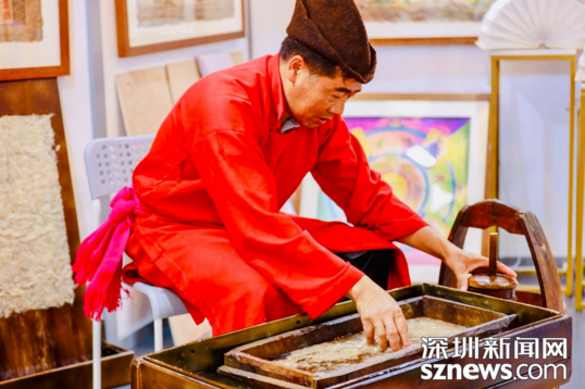 塔城東巴造紙第七代傳承人李學(xué)高在現(xiàn)場持續(xù)“敲、打、洗、晾”的一系列工序,演繹東巴造紙的精湛工藝。東巴紙被稱為“活化石”,是采用納西地區(qū)稀有植物的樹皮制作而成,這些“千年不腐”的東巴紙不僅可用于書寫,添加花瓣、樹枝后的東巴紙燈用作裝飾也非常好看。