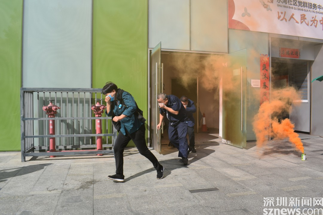社區(qū)巡查人員發(fā)現(xiàn)水灣1979廣場三座發(fā)生火災(zāi),冒出大量濃煙,火勢處于初級階段,著火物質(zhì)不明,便立刻上報并撥打119報火警。確認水灣1979廣場三座發(fā)生火災(zāi)后,社區(qū)立即啟動消防應(yīng)急預(yù)案,消防演練正式開始。