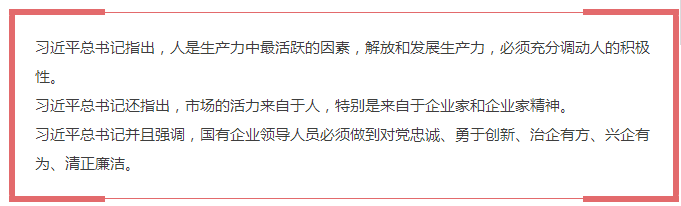 中國特色社會主義進入新時代,建設(shè)現(xiàn)代化經(jīng)濟體系,推動經(jīng)濟發(fā)展質(zhì)量變革、效率變革、動力變革,需要更好發(fā)揮包括國有企業(yè)家在內(nèi)的廣大企業(yè)家的作用。去年黨中央專門印發(fā)了《關(guān)于營造企業(yè)家健康成長環(huán)境,弘揚企業(yè)家精神、更好發(fā)揮企業(yè)家作用的意見》,極大地調(diào)動了企業(yè)家干事創(chuàng)業(yè)的積極性。落實好中央精神,關(guān)心愛護企業(yè)家,需要各方面共同努力。