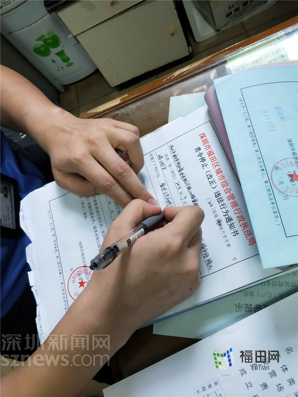 福田街道執(zhí)法隊(duì)給購物公園管理處開具責(zé)令停止(改正)違法行為通知書。