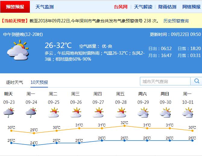 為期三天的假期就要開始了,預計深圳22日多云,午后局地有雷陣雨,氣溫26~32 ℃。23~24日多云間陰天,有短時(雷)陣雨,其中24日中秋夜多云到陰天,短暫時間可見月亮。