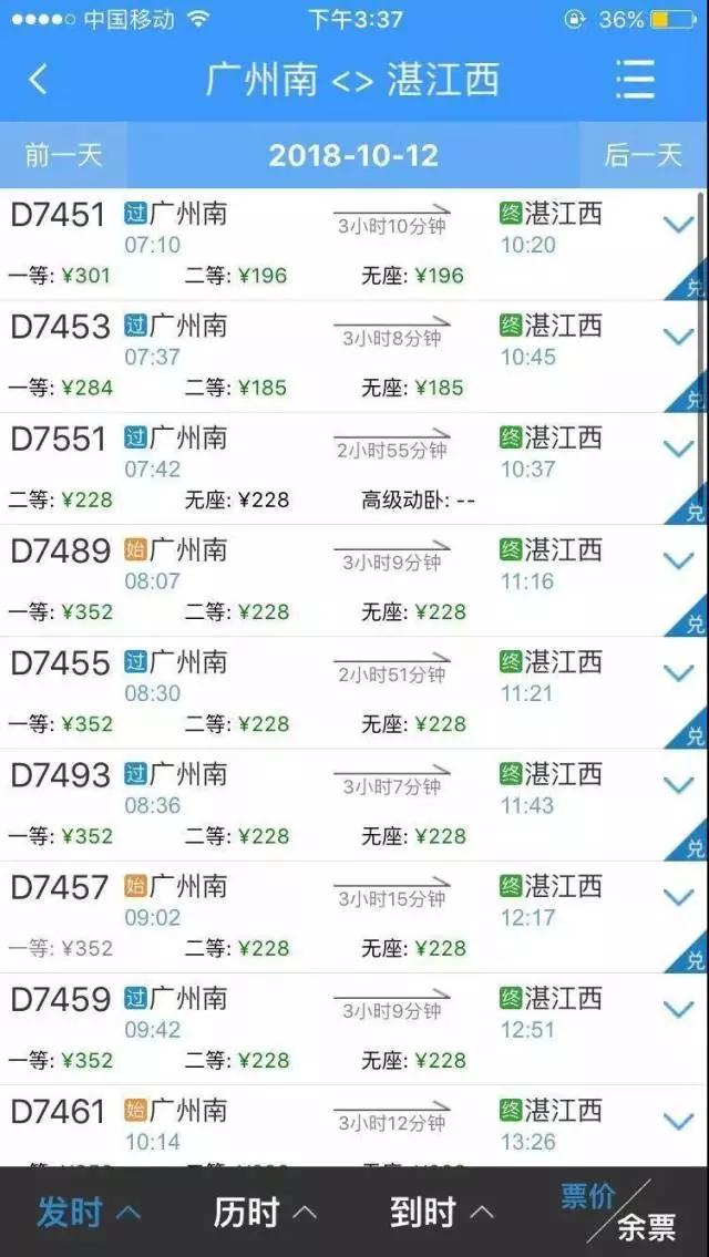 D7453次(7點(diǎn)37分班次)由原來(lái)的228元調(diào)整為185元;
