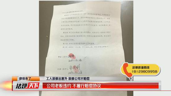 事件發(fā)生后,在記者和龍華區(qū)大良社區(qū)工作站的調(diào)解下,工人朱先生和蜂巢裝飾有限公司雙方達(dá)成了一致的賠償協(xié)議。蜂巢裝飾有限公司的老板陽鋒承認(rèn)朱先生是在其承接的工程施工現(xiàn)場(chǎng)受傷,并承諾給朱先生10萬元的賠償金。在賠償協(xié)議書上,雙方明確約定10萬元的賠償金分兩次支付給朱先生。一次是今年9月10號(hào),支付給工人朱先生7萬元賠償金。一次是今年12月31號(hào),支付3萬元賠償金。但是9月10號(hào)已過,工人朱先生仍然沒有收到蜂巢裝飾有限公司的賠償金,這時(shí)的他有些著急了。