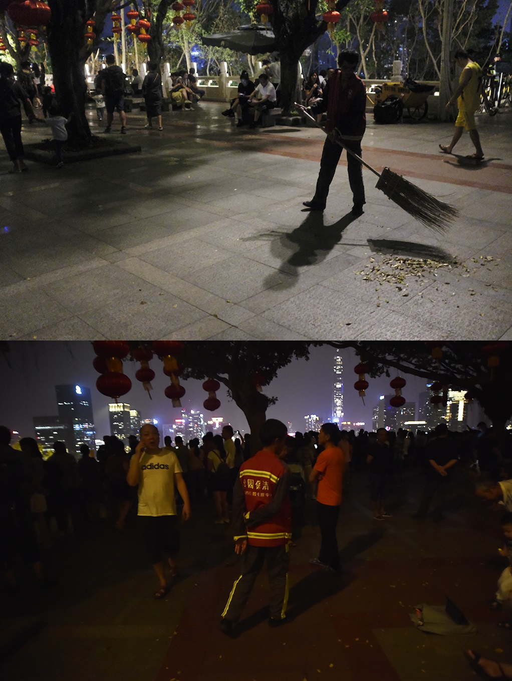 10月8日晚,蓮花山觀景臺的看燈人潮并沒有燈光秀首秀那一天洶涌,燈光表演過后,只有兩名清潔工人留下來進行垃圾清掃?!敖裢砝?。”負責蓮花山觀景臺區(qū)域的環(huán)衛(wèi)工人告訴記者,“我們在燈光秀期間看到垃圾就會及時清理,一般散場之后一個小時是清掃時間,但今天這個工作很快就完成了,深圳人素質(zhì)還是很高的,基本很少有人會亂丟垃圾?!?/p>