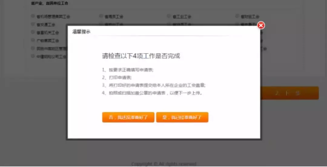 2.根據(jù)“溫馨提示”確認是否已完成,如果未完成,點擊【否,我還沒準備好】,并隨后完成所有工作;如果已完成,點擊【是,我已經(jīng)準備好了】,進入下一個頁面。在申報過程中,長時間在網(wǎng)站頁面停留,會遇到頁面過期,遇到此問題需重新登錄;