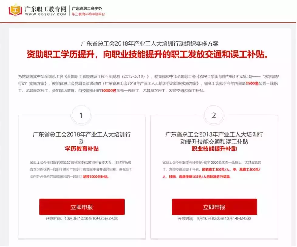 在網(wǎng)站(www.gdzgjy.com)首頁左側(cè)【申報(bào)與補(bǔ)貼申領(lǐng)入口】,點(diǎn)擊“廣東省總工會(huì)產(chǎn)業(yè)工人大培訓(xùn)學(xué)歷、職業(yè)補(bǔ)貼申領(lǐng)”界面,選擇右側(cè)“職業(yè)技能提升補(bǔ)助”點(diǎn)擊【進(jìn)入申領(lǐng)】。