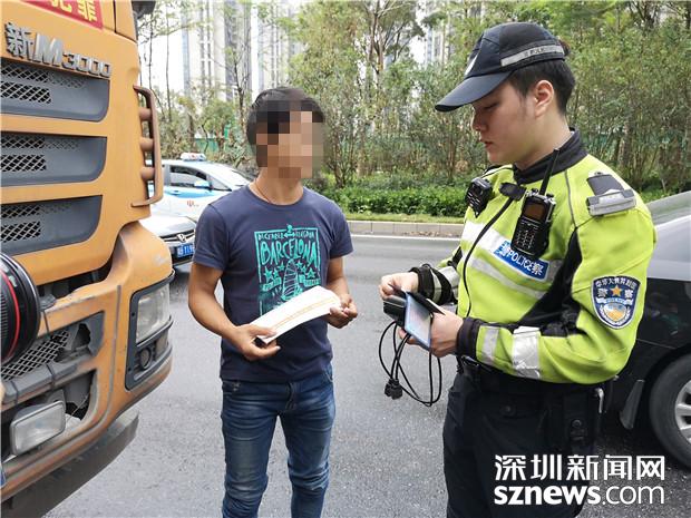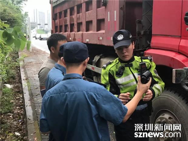 深圳交警民警檢查泥頭車駕駛員的相關(guān)證件